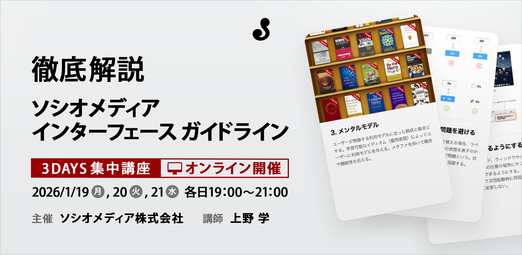 2026年1月19日、20日、21日の3日間で、オンラインセミナー「【徹底解説】ソシオメディア・インターフェースガイドライン」を開催します。