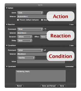 ひとつのインタラクション、つまり「ユーザーがボタンAをクリックした時、もしテキストボックスBの内容が空なら、テキストボックスBの背景が黄色になる」というものを分解すると、「1. ボタンAをクリック」「2. テキストボックスBの背景が黄色になる」「3. もしテキストボックスBが空なら」という三つの要素になります。すなわちひとつのインタラクションは次の三つの要素で構成されることになります。